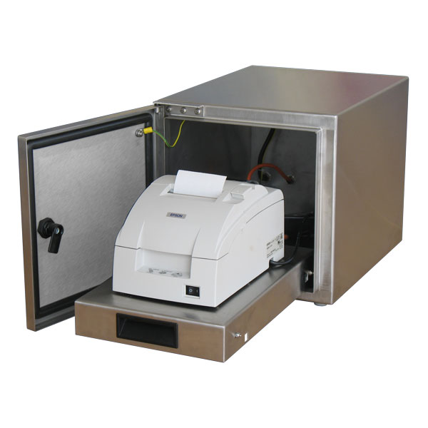 The airtight shield made of stainless steel protects a printer against defects, and allows for operation in not adapted places.