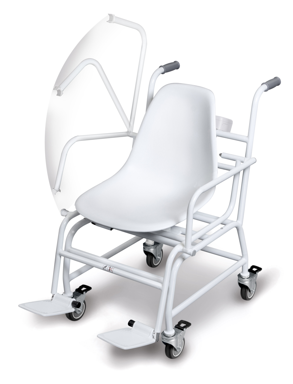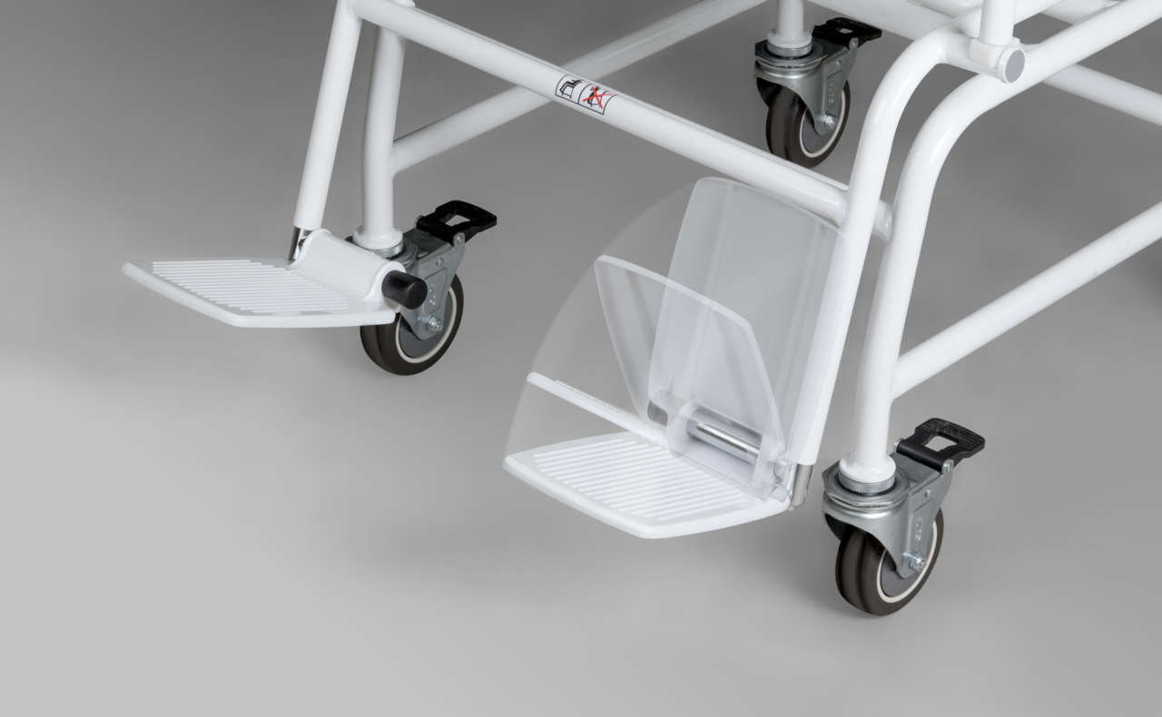 - Twee omklapbare armleuningen en voetensteunen vergemakkelijken het plaats nemen. Ideaal voor patiënten met overgewicht of voor een overgang zonder obstakels bijv. van het bed naar de stoelweegschaal
